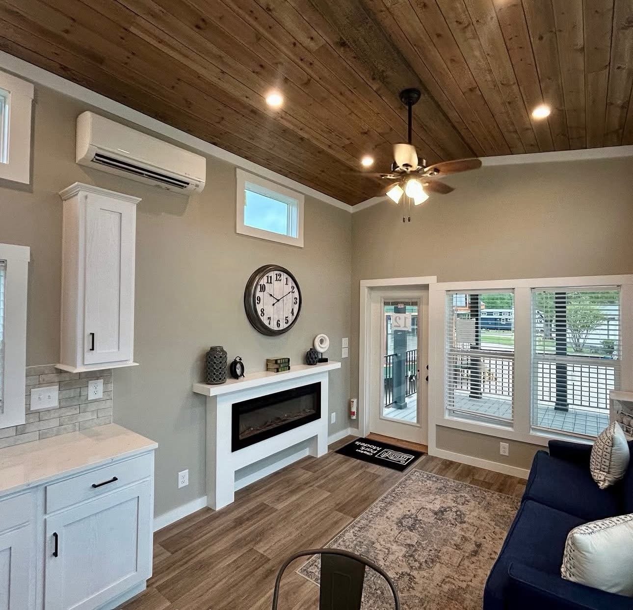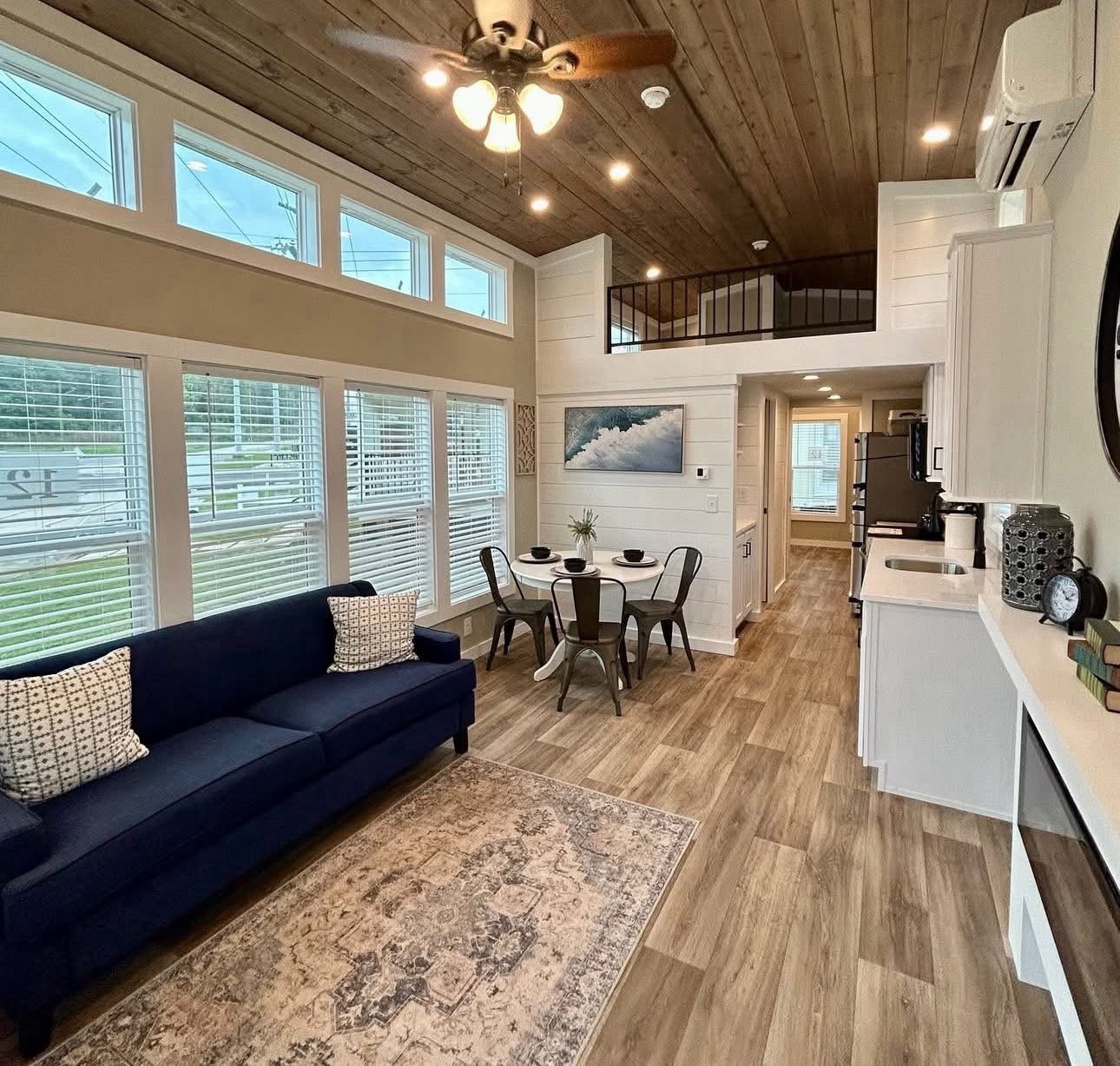 Upstairs the loft is spacious with room for 2 beds! Also shown with ship lap accents, and a stained wood ceiling!