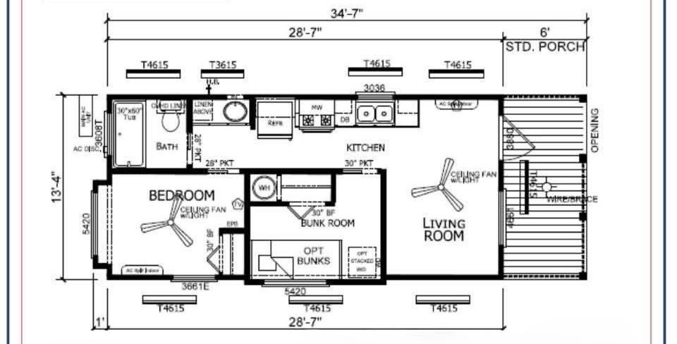 This model features a smartly designed bunk room — perfect for kids, guests, or even extra storage — plus space for a queen-size bed in the main sleeping area.