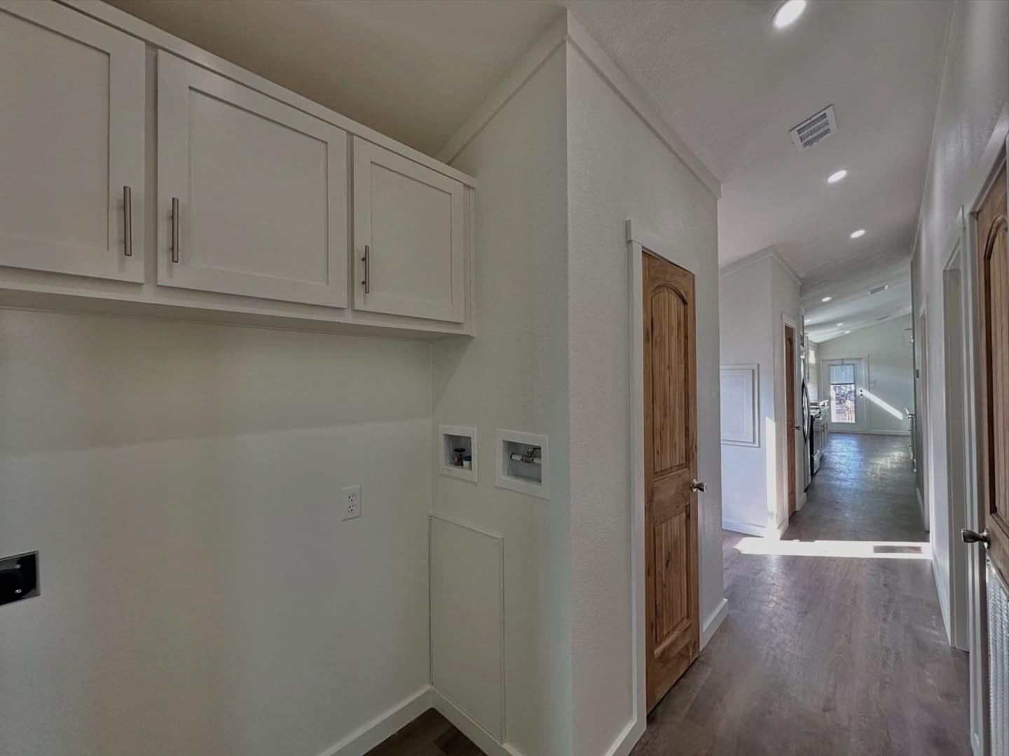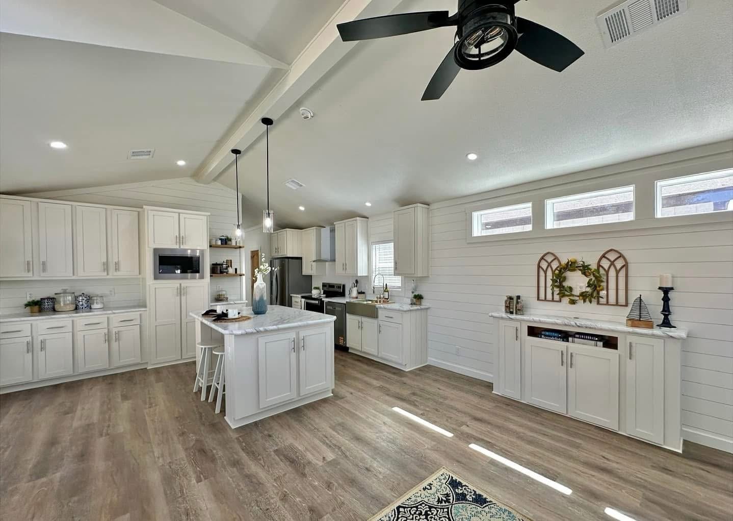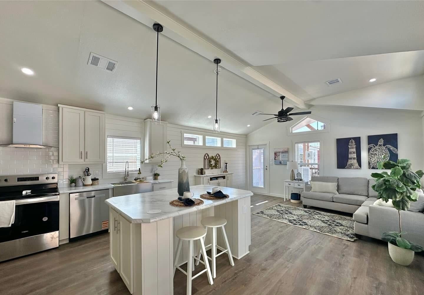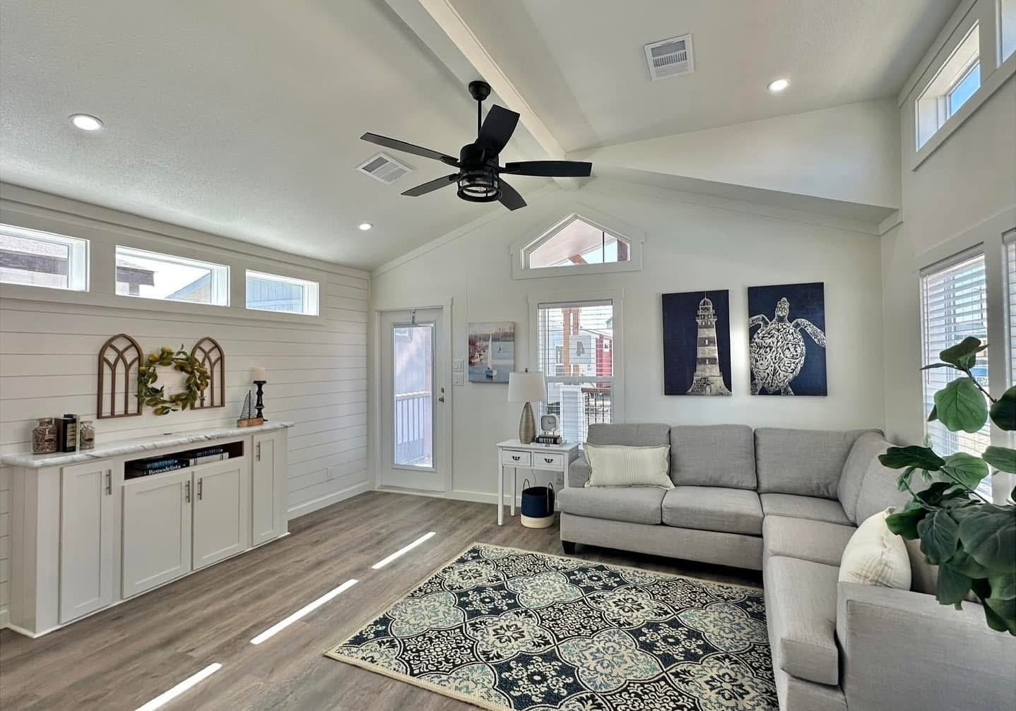 – Beam ceiling with shiplap accent wall in main living area