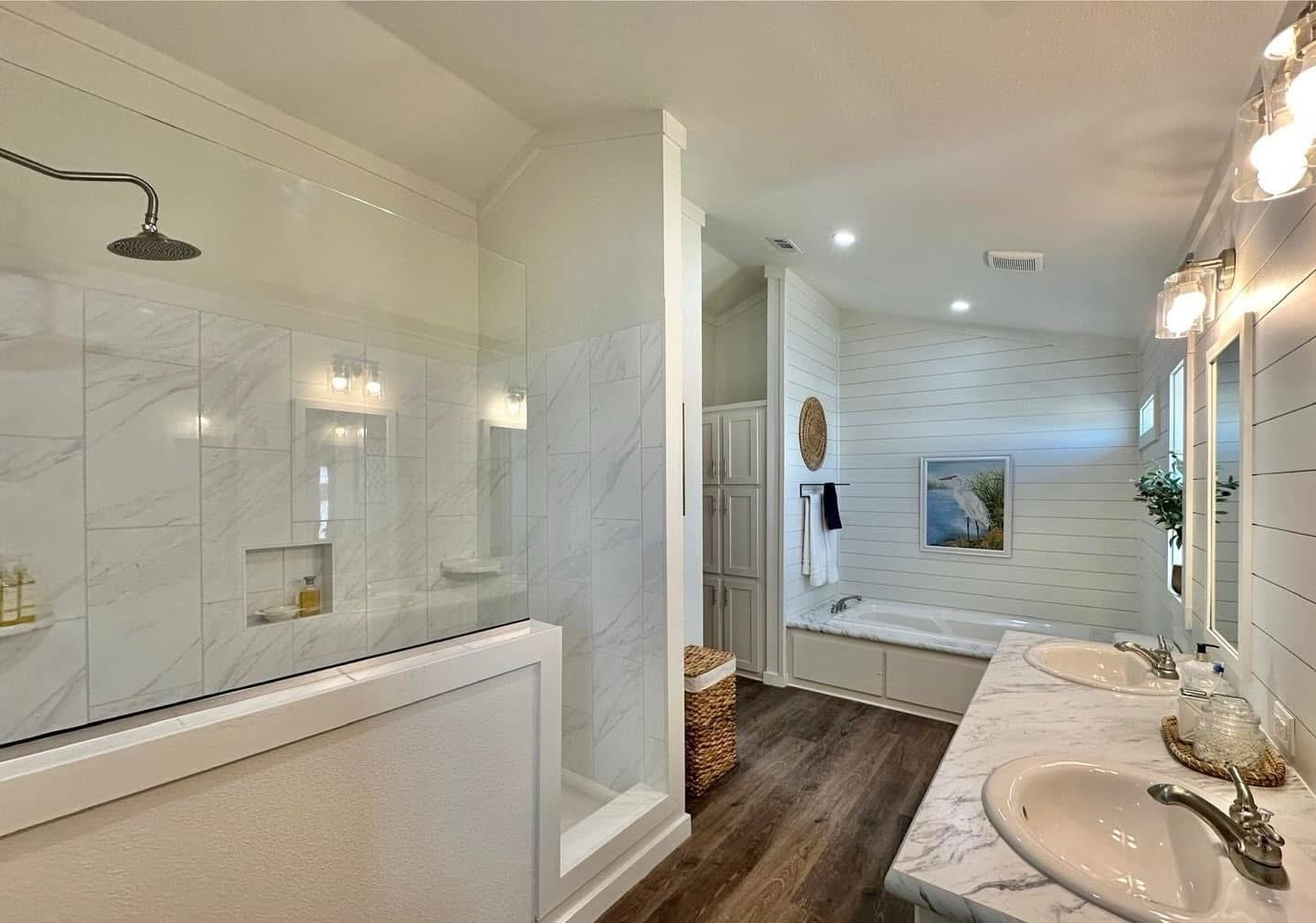 – Large bathroom with mosaic tile shower and separate bathtub