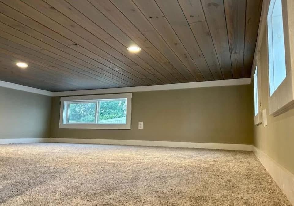 Sunroom vibes with a living room that appears detached from the rest of the home 270° views with floor-to-ceiling windows Electric fireplace with shiplap accent wall