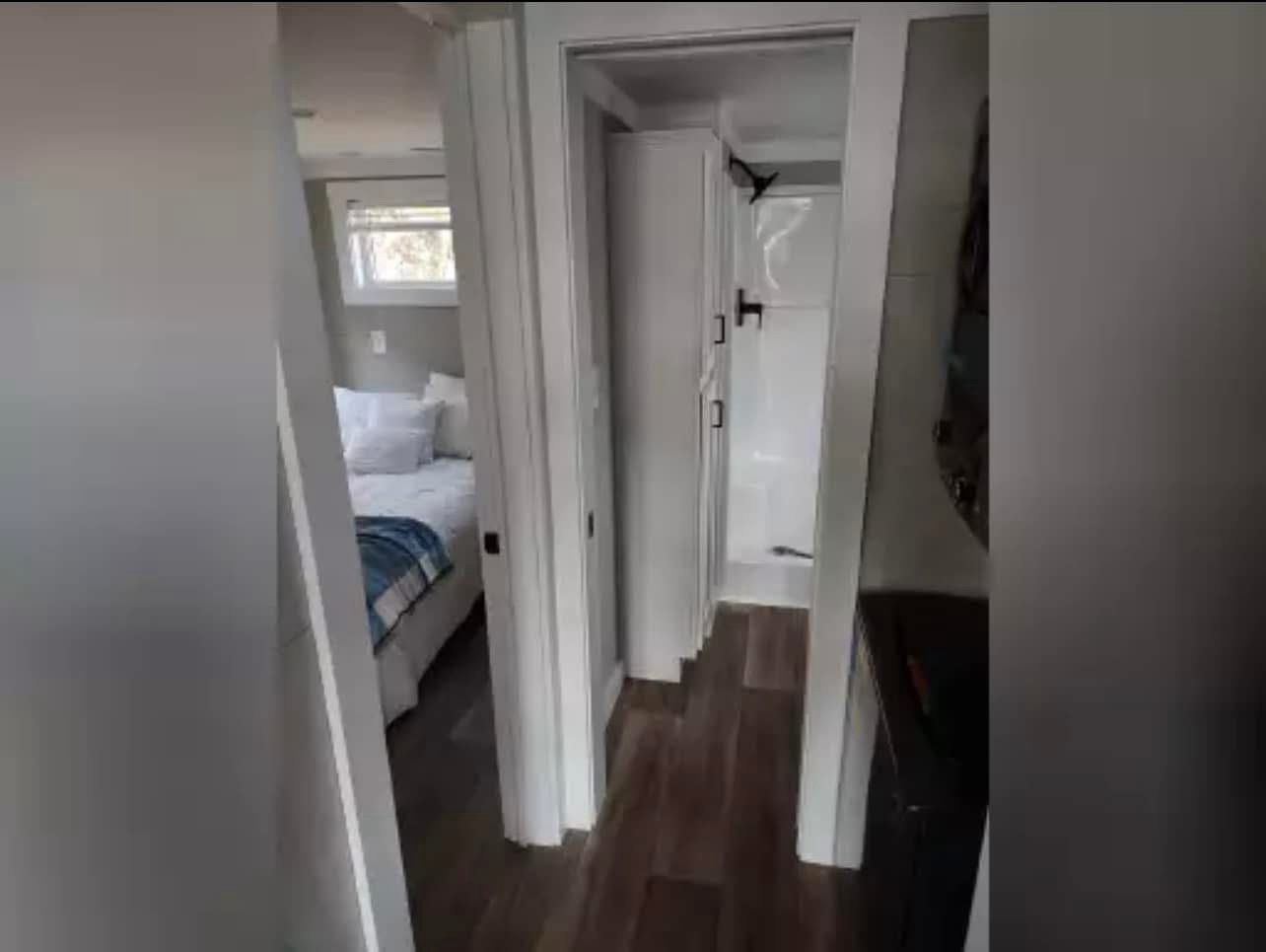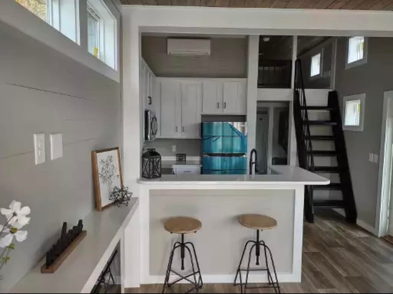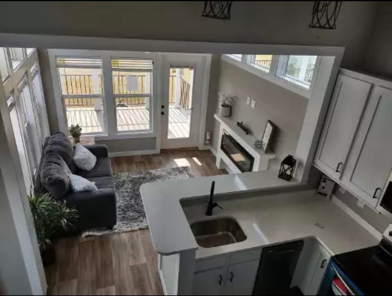 The Serenity Suite model tiny home is a 394 square feet, 12′ x 45′, 1 bedroom, 1 bath RV park model with a loft that comfortably sleeps 6 people.