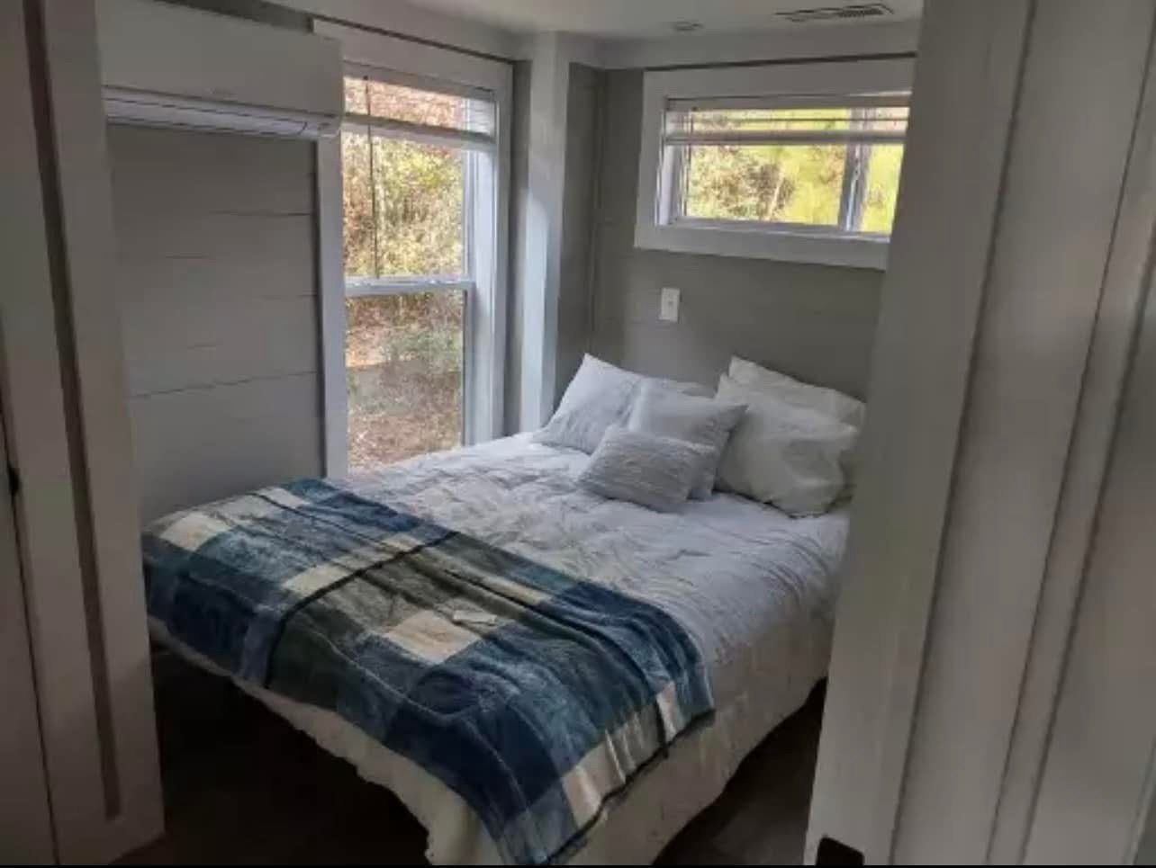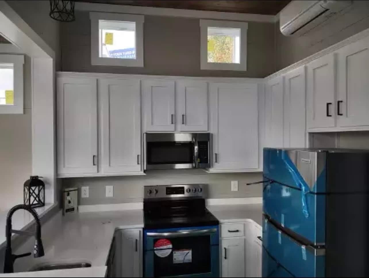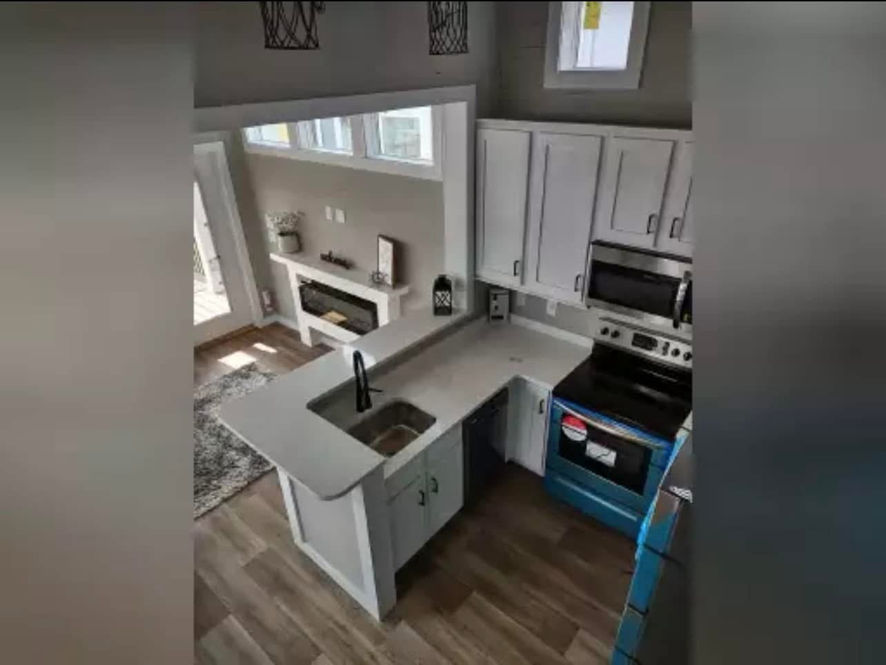 The Serenity Suite model tiny home is a 394 square feet, 12′ x 45′, 1 bedroom, 1 bath RV park model with a loft that comfortably sleeps 6 people.