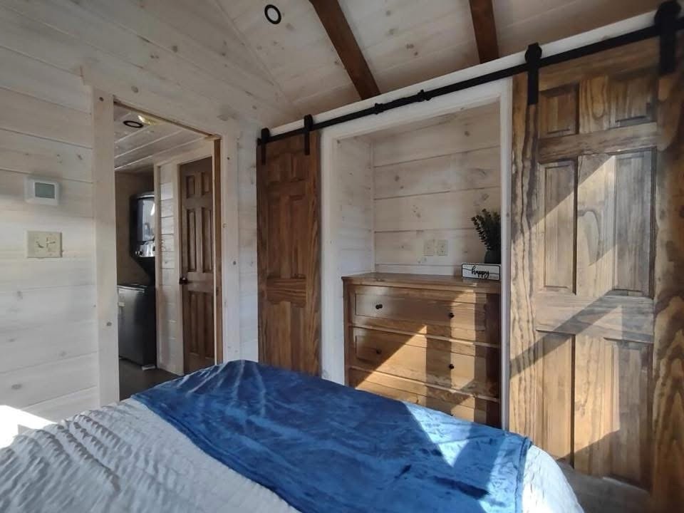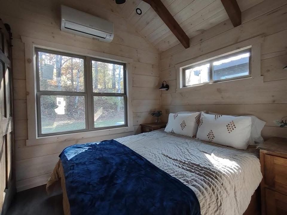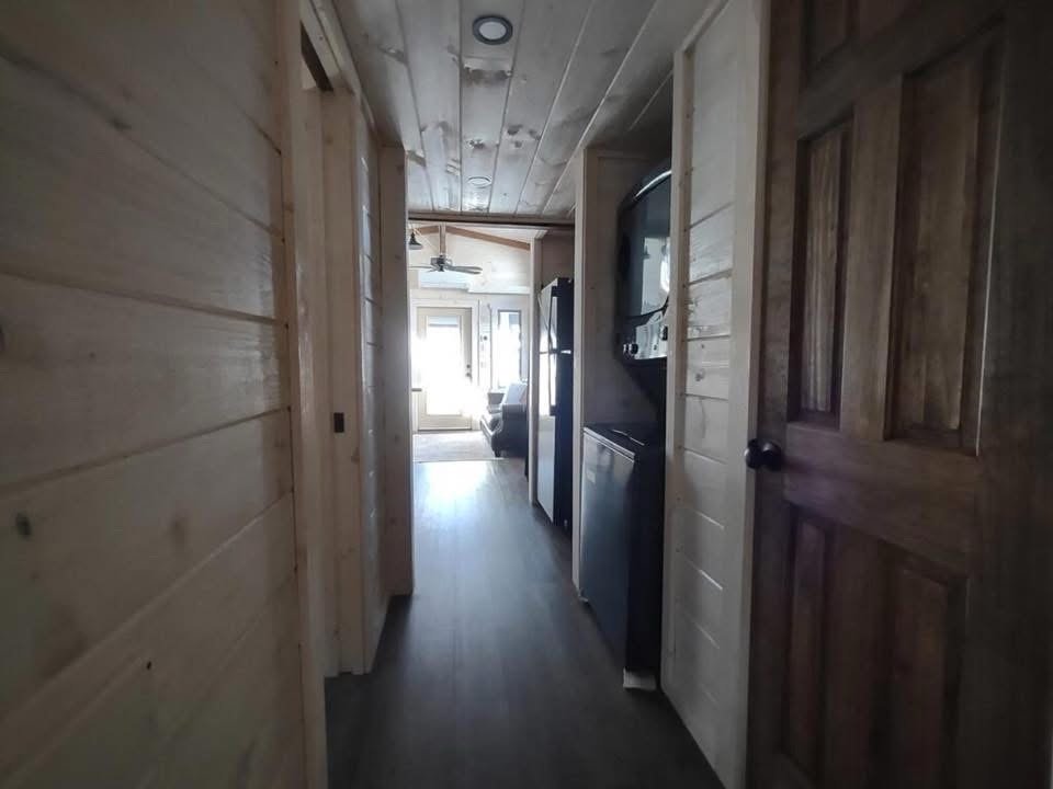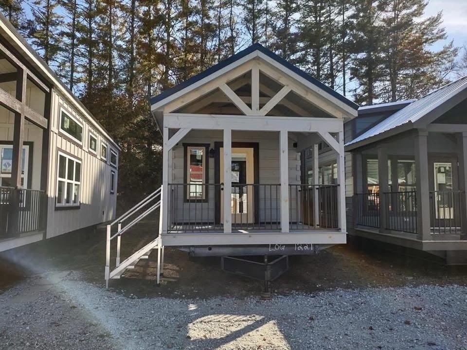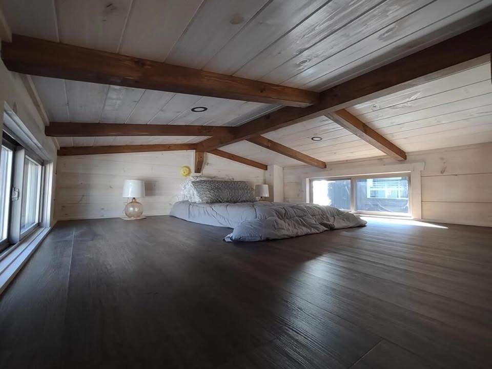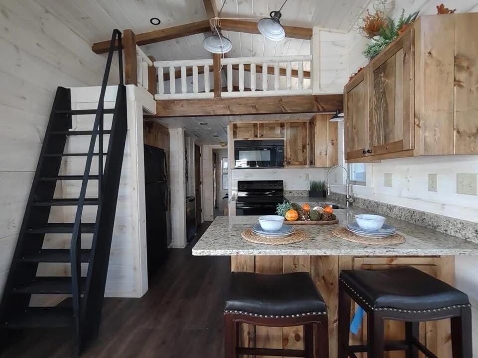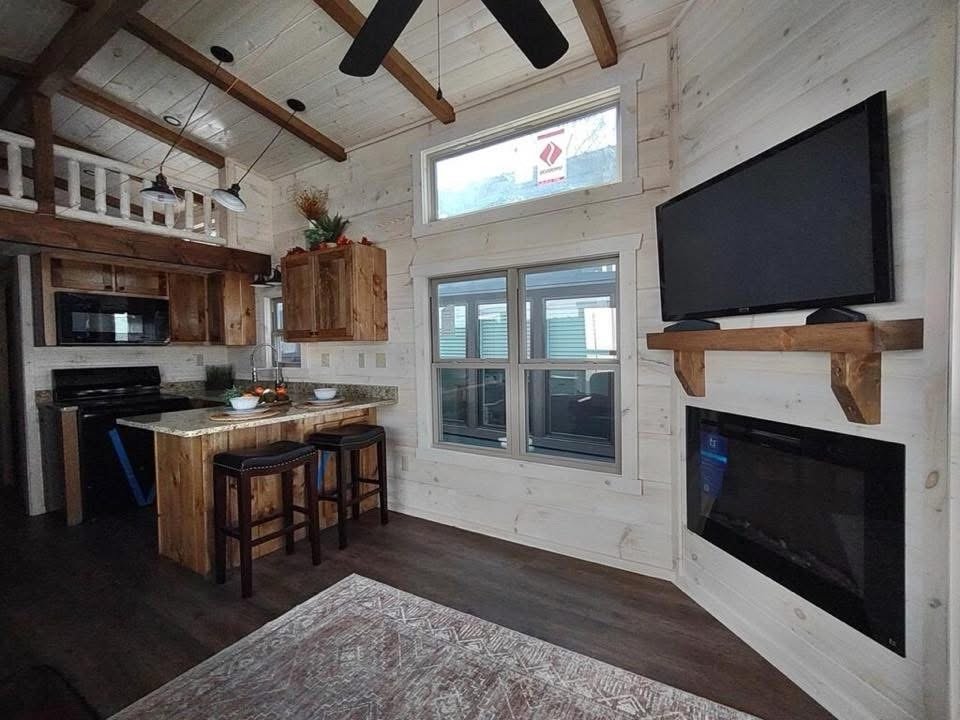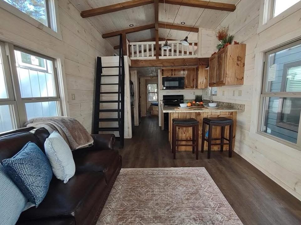 This Smoky model tiny home is a 384 square feet, 12′ x 32′, 1 bedroom, 1 bath RV park model with 1 loft that comfortably sleeps 6 people.