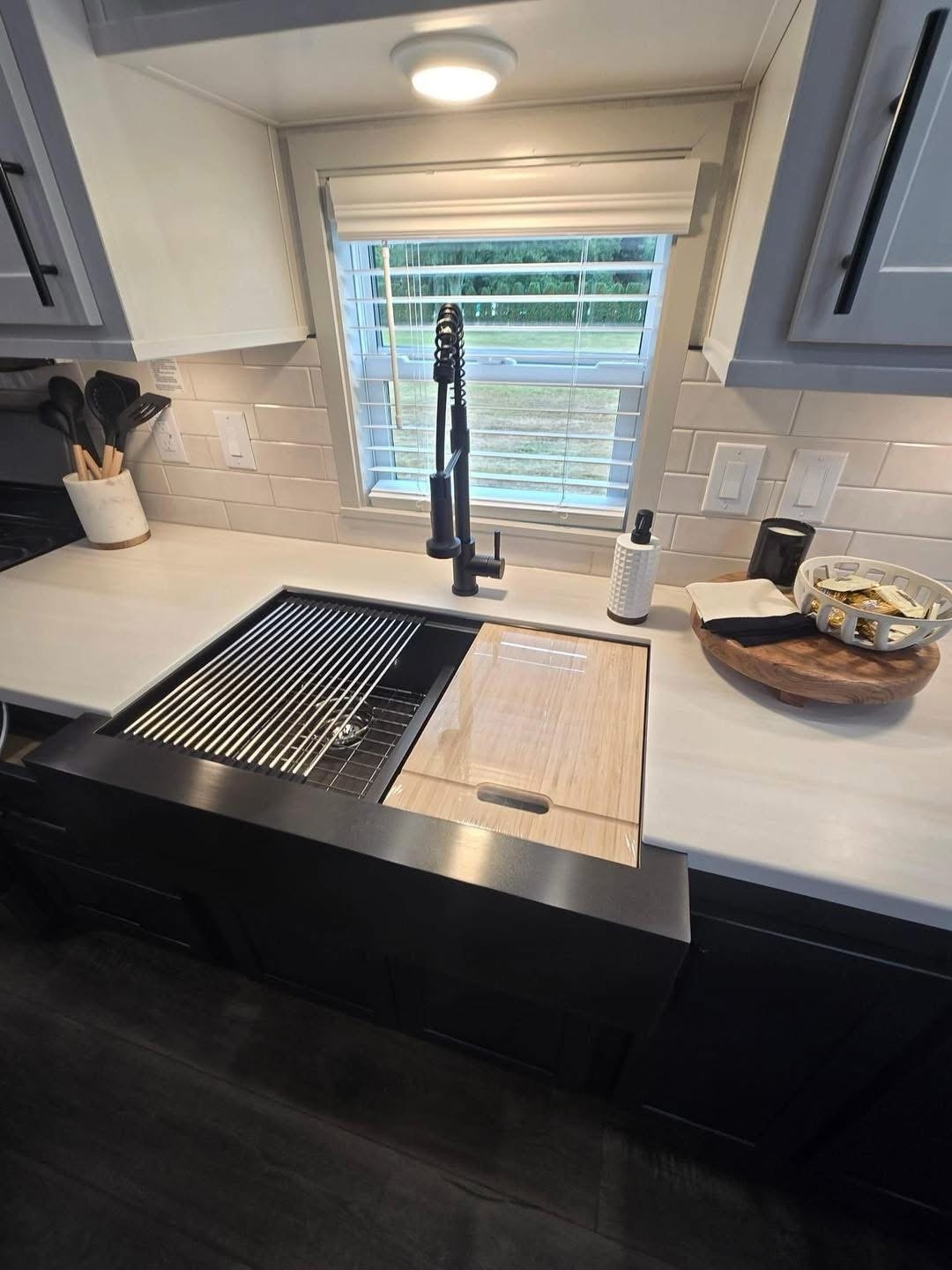 • Full Kitchen: Spacious countertops, farmhouse sink, black appliances