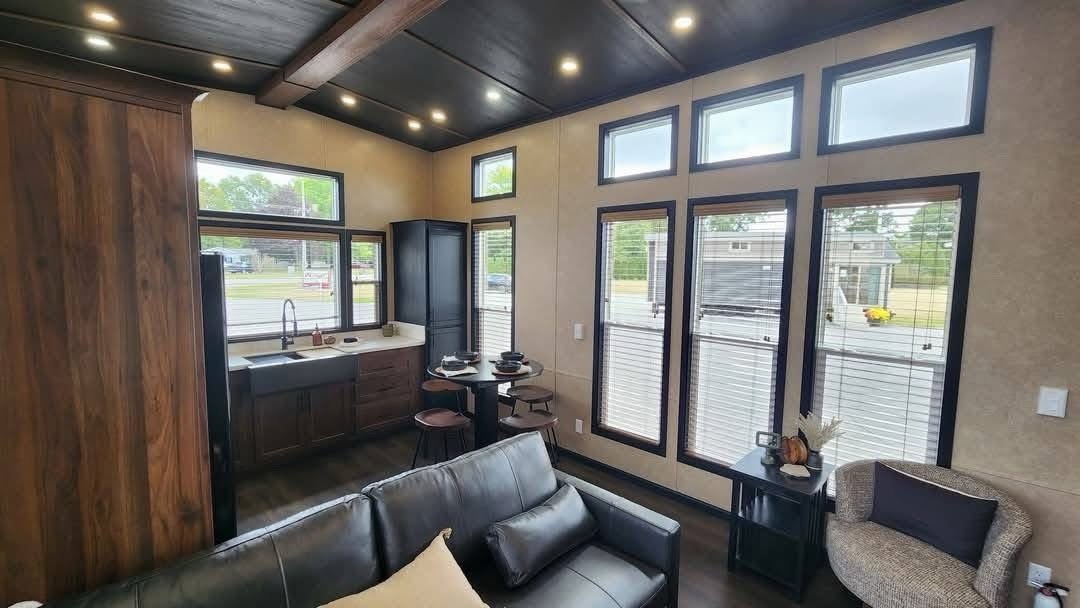 • Modern recessed lighting and dark ceiling beams for a cozy, upscale look